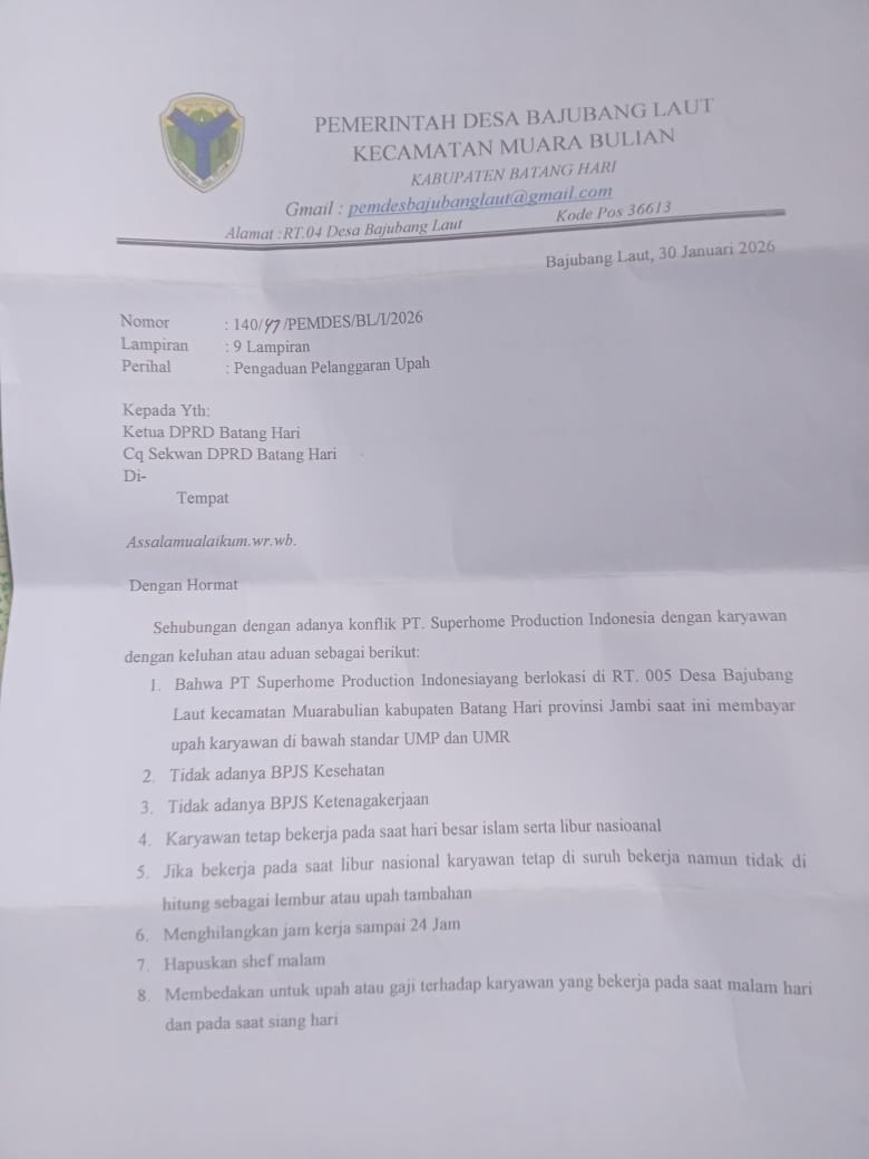 Dalam surat itu, Pemerintah Desa Bajubang Laut menyampaikan adanya konflik antara pihak perusahaan dengan karyawan yang bekerja di PT Superhome Production Indonesia, yang berlokasi di RT 005 Desa Bajubang Laut. Sejumlah dugaan pelanggaran yang dilaporkan antara lain pembayaran upah karyawan yang dinilai berada di bawah standar Upah Minimum Provinsi (UMP) dan Upah Minimum Regional (UMR).
